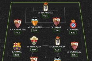Whoscored评本轮西甲最佳阵:亚马尔领衔,塞维利亚4将入选