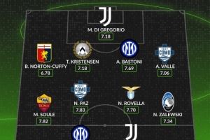 后卫:诺顿-库菲(热那亚,6.78分)、T-克里斯滕森(乌迪内斯,7.18分)、巴斯托尼(国米,7.69分)、亚历克斯-瓦莱(科莫,7.06分)