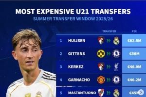 德转今夏U21最贵转会:赫伊森压吉滕斯居首 科尔克兹&加纳乔在列