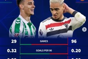 安东尼效力贝蒂斯每90分钟进0.32球、助攻0.23次,均高于曼联时期