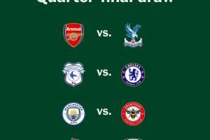 联赛杯1/4决赛对阵:阿森纳vs水晶宫,曼城vs布伦特福德